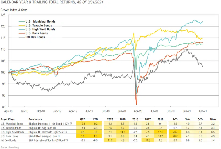 Bloomberg Barclays Municipal Index: Consists of a broad selection of investment-grade general obligation and revenue bonds of maturities ranging from one year to 30 years. It is an unmanaged index representative of the tax-exempt bond market.
