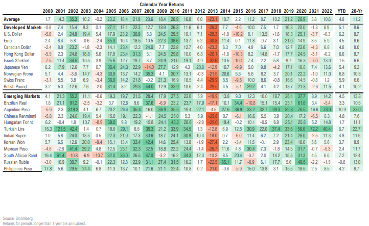 Bloomberg Barclays Global Aggregate ex-USD Index: A multi-currency measure of investment grade debt from 24 local currency markets. This benchmark includes treasury, government-related, corporate and securitized fixed-rate bonds from both developed and emerging markets issuers. Bonds issued in USD are excluded.