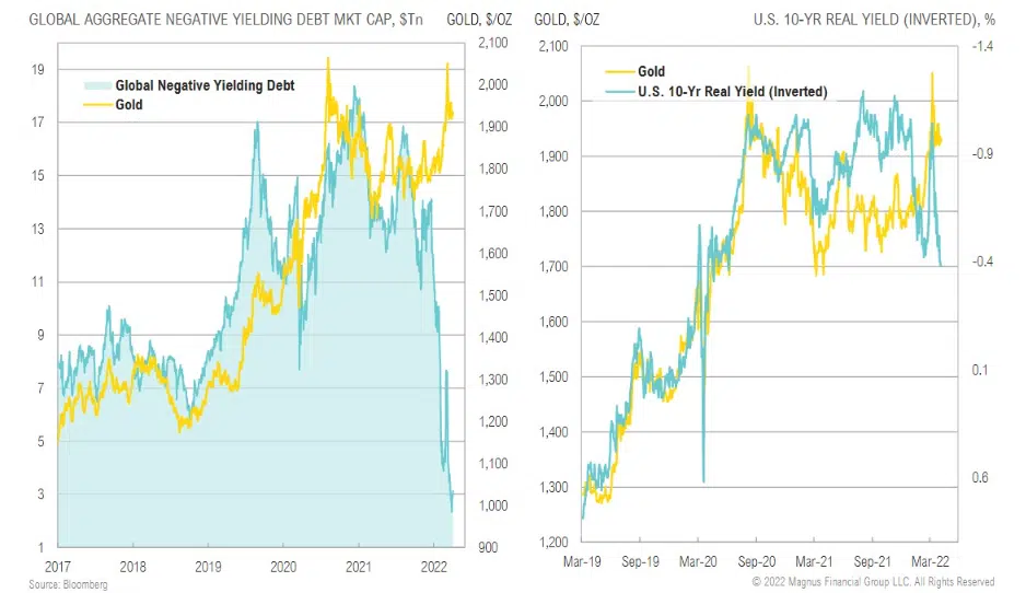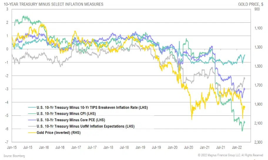 Real yields have remained deeply negative; gold has started to catch up as inflation expectations move back higher and geopolitical risks materialize