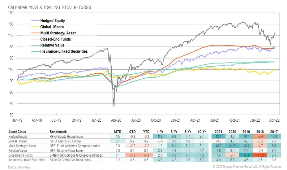 HFRX Macro/CTA Index: Macro strategy managers trade a broad range of strategies in which the investment process is predicated on movements in underlying economic variables and the impact these have on equity, fixed income, hard currency and commodity markets. Managers employ a variety of techniques, both discretionary and systematic analysis, combinations of top down and bottom up theses, quantitative and fundamental approaches and long and short-term holding periods.