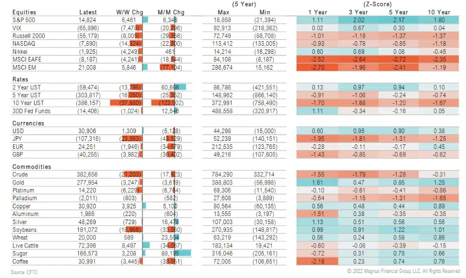 Futures spec positioning shows large increase in bullish bets in commodities and bearish bets in bonds
