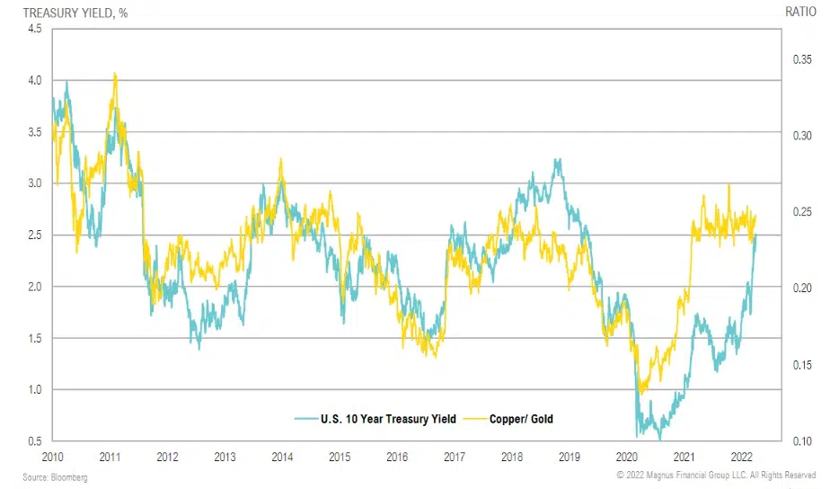 10-year Treasury closed the gap with copper/gold ratio; no clear signal from here, but could suggest rate increases will slow, roll over
