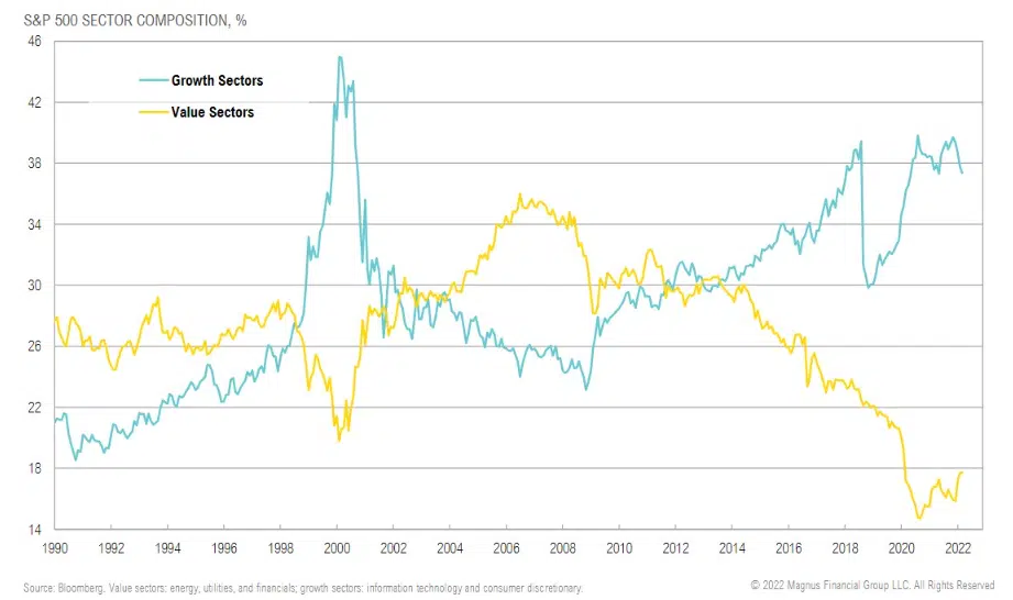 The weight of technology and consumer discretionary stocks in the S&P 500 has dropped to 37% but still near historical highs
