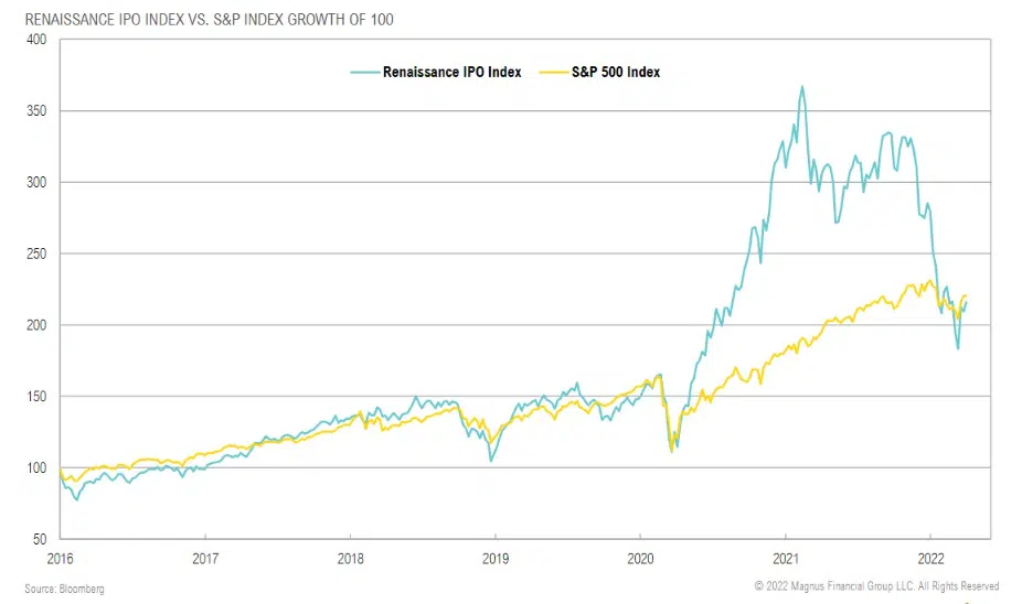 Renaissance IPO Index has had a modest rebound but remains 41% off ATH; S&P 500 has retraced 4.6% since the start of the year
