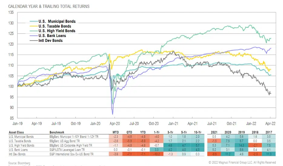 Most U.S. fixed income and credit asset classes were down in March, U.S. high yield fairing relatively well; international developed bonds worst performer