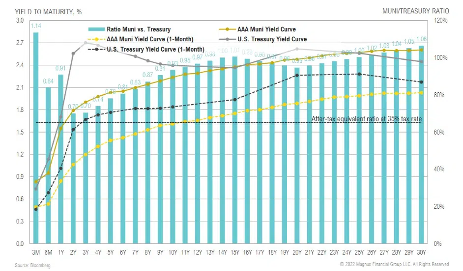 Muni-Treasury ratio: short-term municipal bond yields are looking relatively attractive compared to taxable bonds