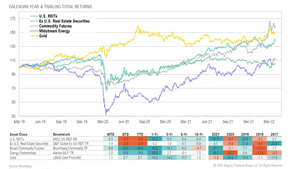 Commodities and U.S. REITS outperformed in March; U.S. REITs have struggled along with risk assets more broadly ytd