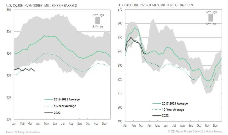 Crude oil inventories remain well below long-term averages while gasoline inventories are roughly in line with average