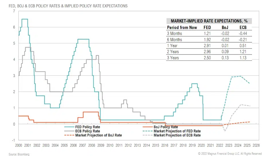 Relative rate expectation differences of U.S. vs. Europe and Japan are still dramatic, supporting the U.S. dollar, but note how market now pricing in rate cuts after 2023