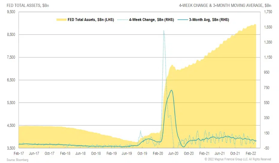 Despite talk of QT, the Fed has remained obtusely loose with a 3-month average increase of $45 billion, bringing balance sheet to $9 trillion