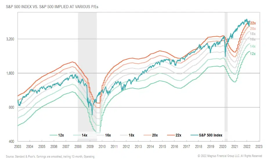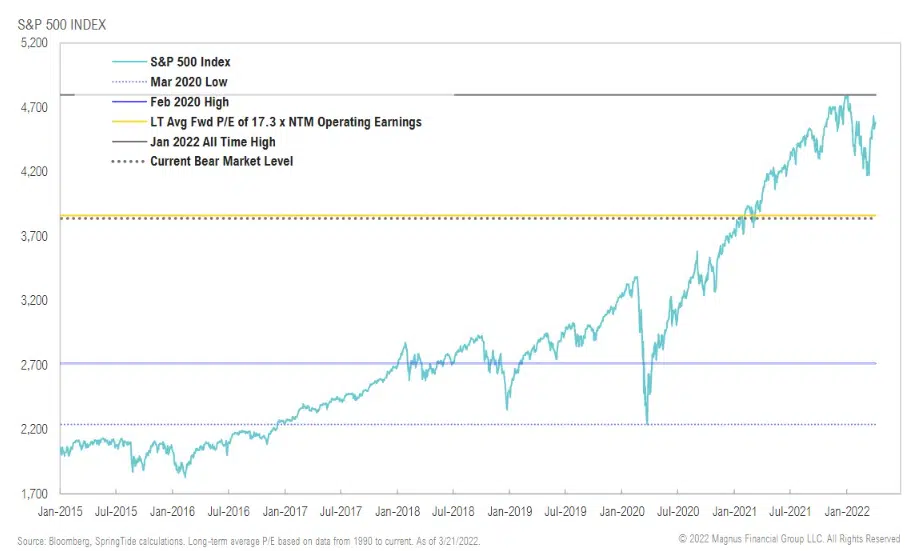 Markets have pulled back from ATH’s, but are still a long way from bear market levels; interestingly, bear market line is equal to long-term average market valuation