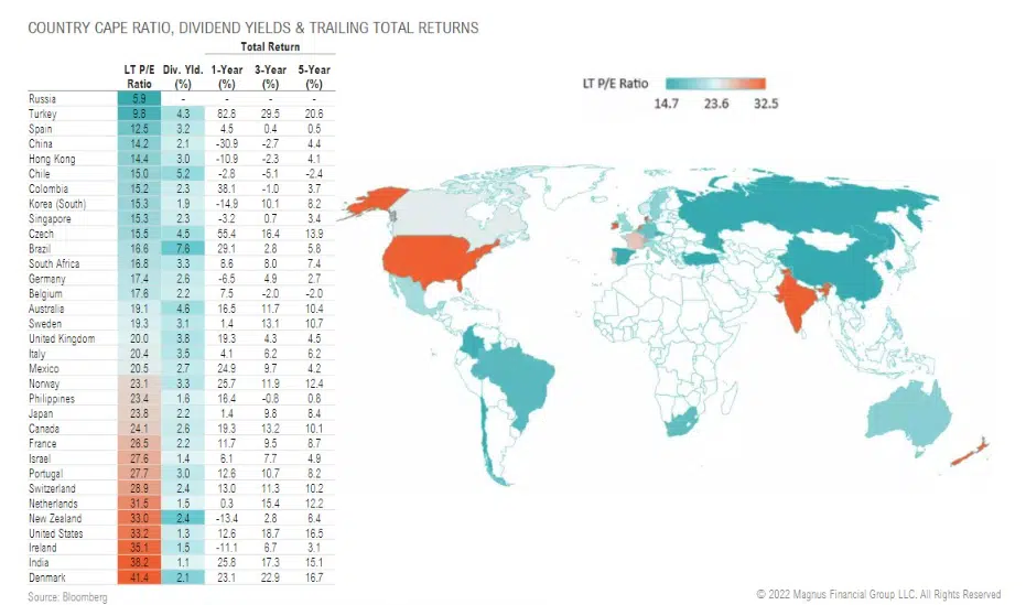 Cyclically-adjusted P/E (CAPE) multiples by country; >5% yields in Brazil and Chile, Russian markets are effectively closed for offshore investors