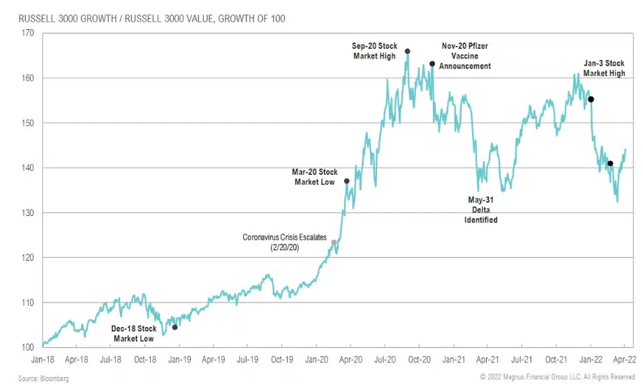 Value outperformed growth post vax announcements; growth’s 2H21 outperformance nearly retraced that lost ground but has since rolled over as rising rates take over as primary driver