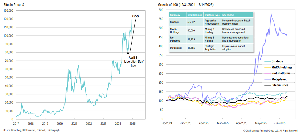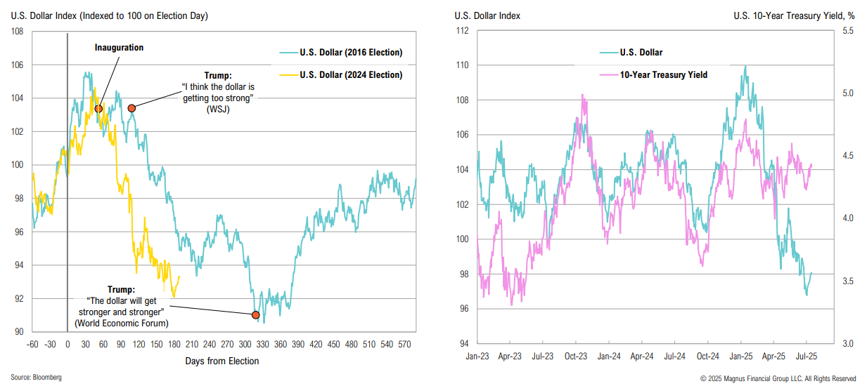 A weaker dollar is also part of Trump’s policy preference (boost U.S. exports, support domestic manufacturing); the U.S. Dollar Index reached a three-year low on July 2