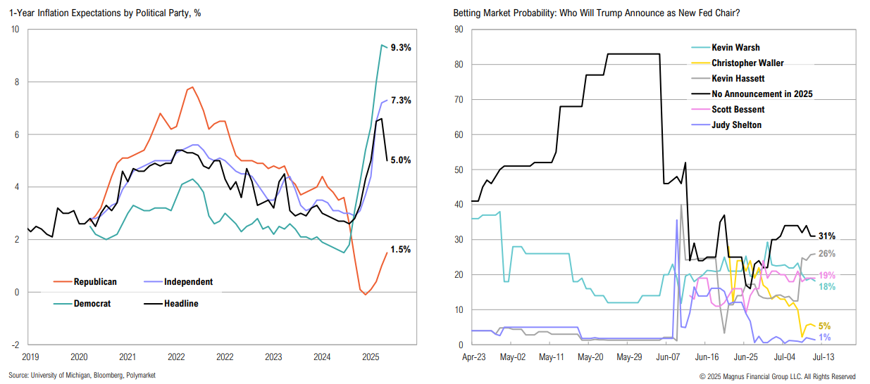 Inflation expectations have started to moderate; Trump is expected to announce new Fed chair well before Powell’s term ends in May 2026 (frontrunner Hassett favors aggressive cuts)