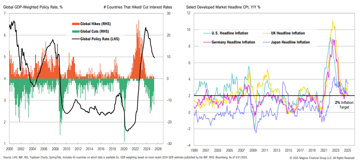 Globally, the unwind of the 2022 – 2023 hiking cycle continues—this is the greatest cutting cycle outside of a major recession or pandemic; DM inflation remains >2%