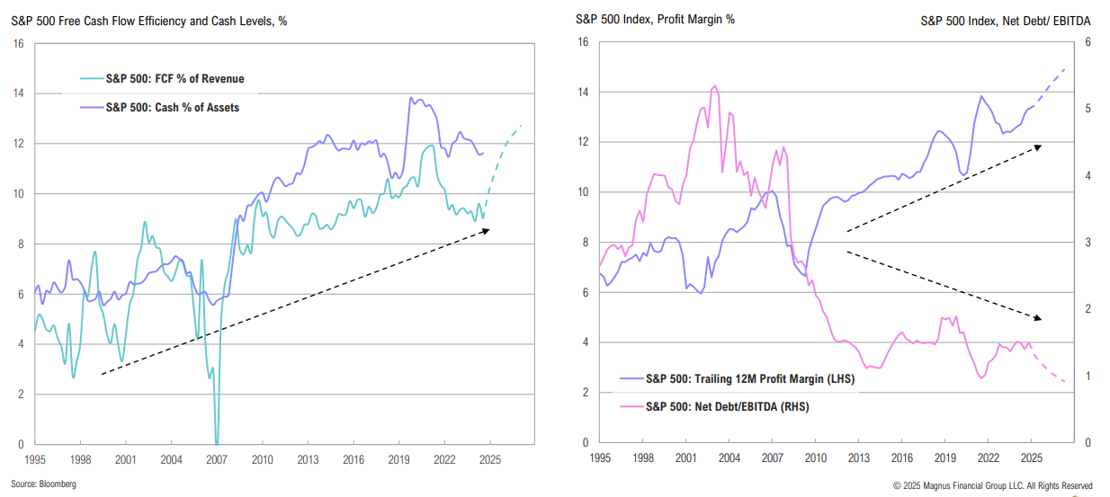 The corporate sector is strong by historical standards: capital expenditures, R&D, and tech investment have boosted scalability and efficiency, enabling improved margins and reducing debt