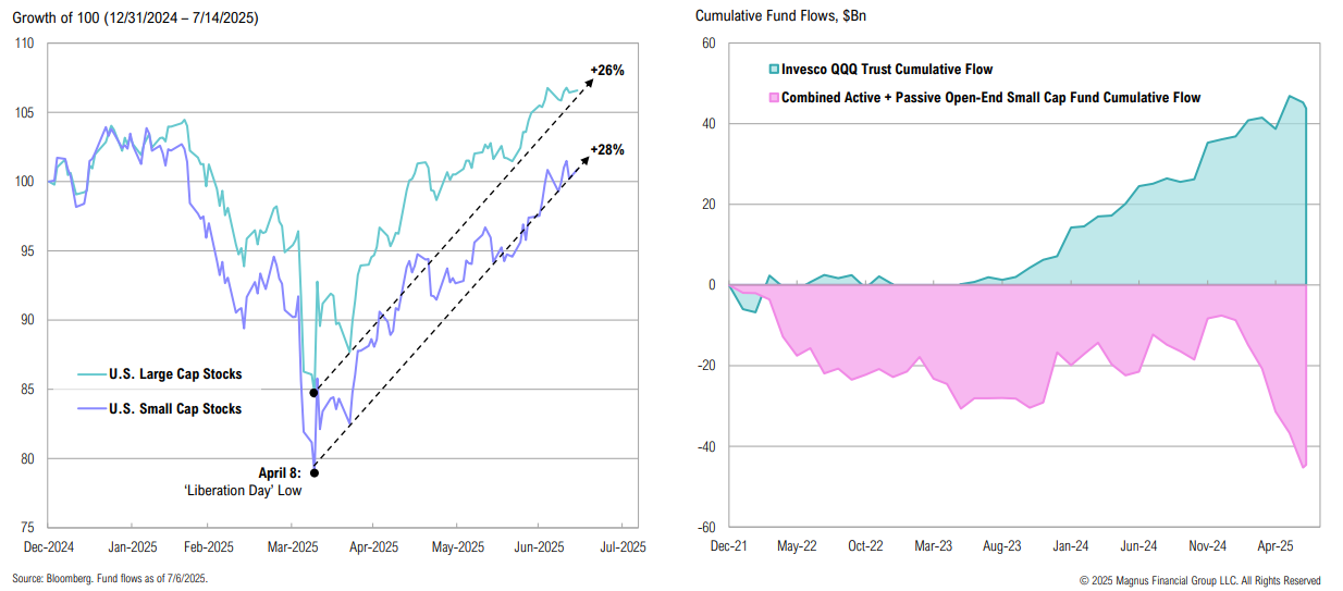 Small cap stocks have outperformed large caps since the April 8 lows (by 2%); YTD, open-end small cap funds have seen $37Bn in outflows—fully offset by inflows into the QQQ ETF alone