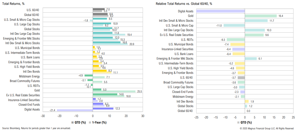 Major winners over Q2 included intl. dev small & micro-cap stocks (+16.6%) and ex-U.S. real estate (+14.6%) while midstream energy (-4.9%) and broad commodity futures (-3.1%) lagged