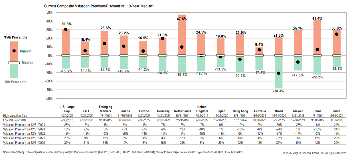 The U.S. is trading above its 10-year 95th percentile high valuation; Brazil & Mexico are the only countries trading meaningfully below median, with Hong Kong and Japan just below median