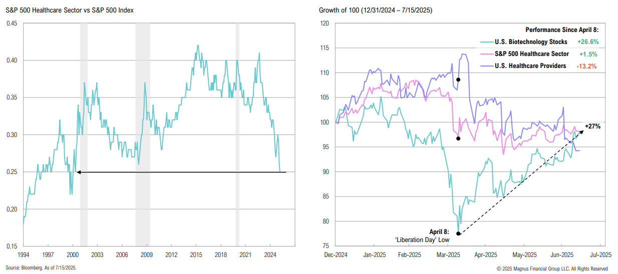 Relative to the S&P 500, the healthcare sector is at its lowest level since 2000; while the healthcare sector is up 1.5% since the April 8 lows, the biotech sector has gained 27%