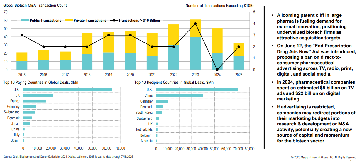 Biotech M&A activity has been strong YTD; sector tailwinds including a looming patent cliff in big pharma is driving demand for external innovation, and a bill proposed to ban pharma advertising
