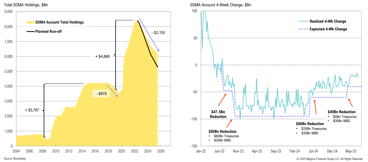 Since April 1, the Fed has slowed QT from $60 billion to $40 billion, with a maximum Treasury runoff of $5 billion per month