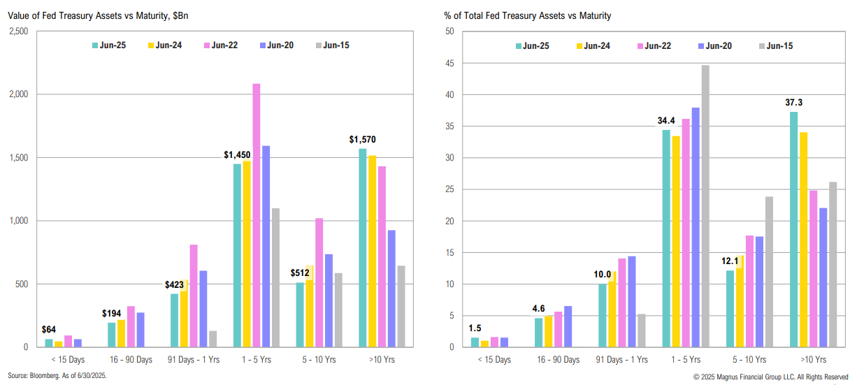 ~16% ($681bn) of the Fed’s balance sheet assets are maturing within the next year—far more than the $5bn monthly roll-off target; this implies the Fed will purchase >$600bn in debt (with the proceeds of maturing bonds)