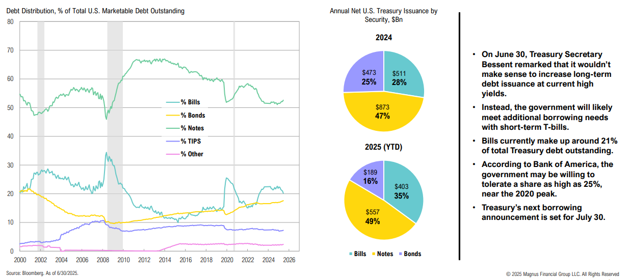 Treasury Secretary Bessent has stated that raising long-term debt at current high yields is unlikely; additional borrowing will likely come from short-term T-bills