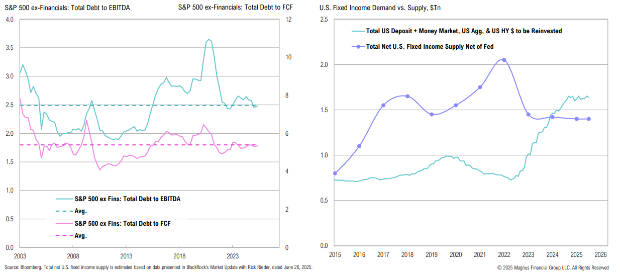 Tight U.S. corporate yields are a result of stable fundamentals, manageable maturities, and strong supply-demand dynamics; the U.S. fixed income market is generating over $1.6tn in annual coupons—more than the total net supply of U.S. fixed income