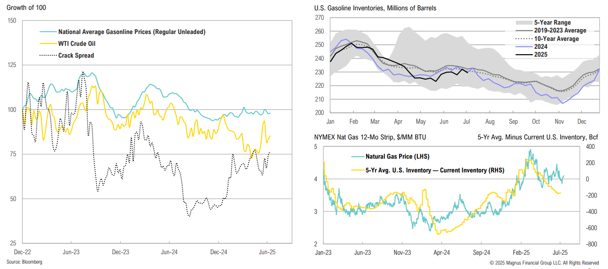 Balanced energy markets: due to higher refining costs, lower crude prices ≠ cheaper gasoline; softer natural gas prices amid strong seasonal restocking signal looser market conditions