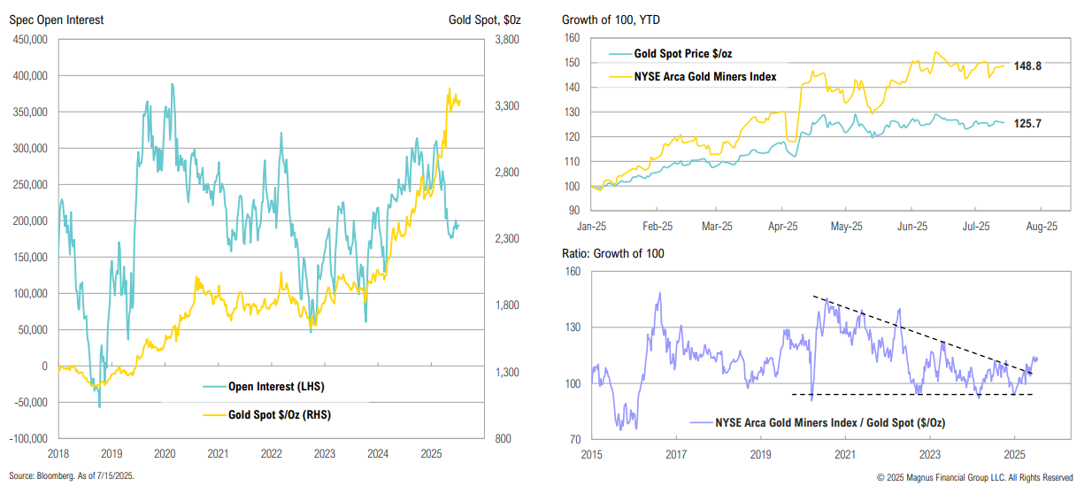 Despite only modestly off all-time highs, gold spec positioning has declined; while gold miners have seen strong YTD outperformance, fundamentals remain attractive