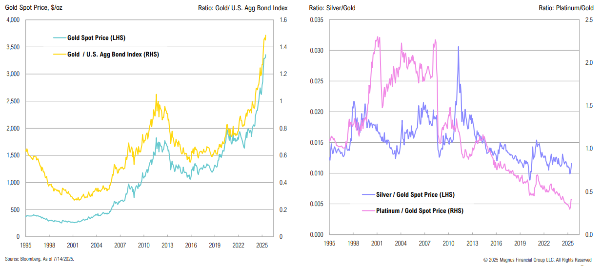 Gold has significantly outperformed bonds long term, despite offering no yield; platinum and silver (which share some of gold’s precious metal attributes) are trading near 30-year lows relative to gold