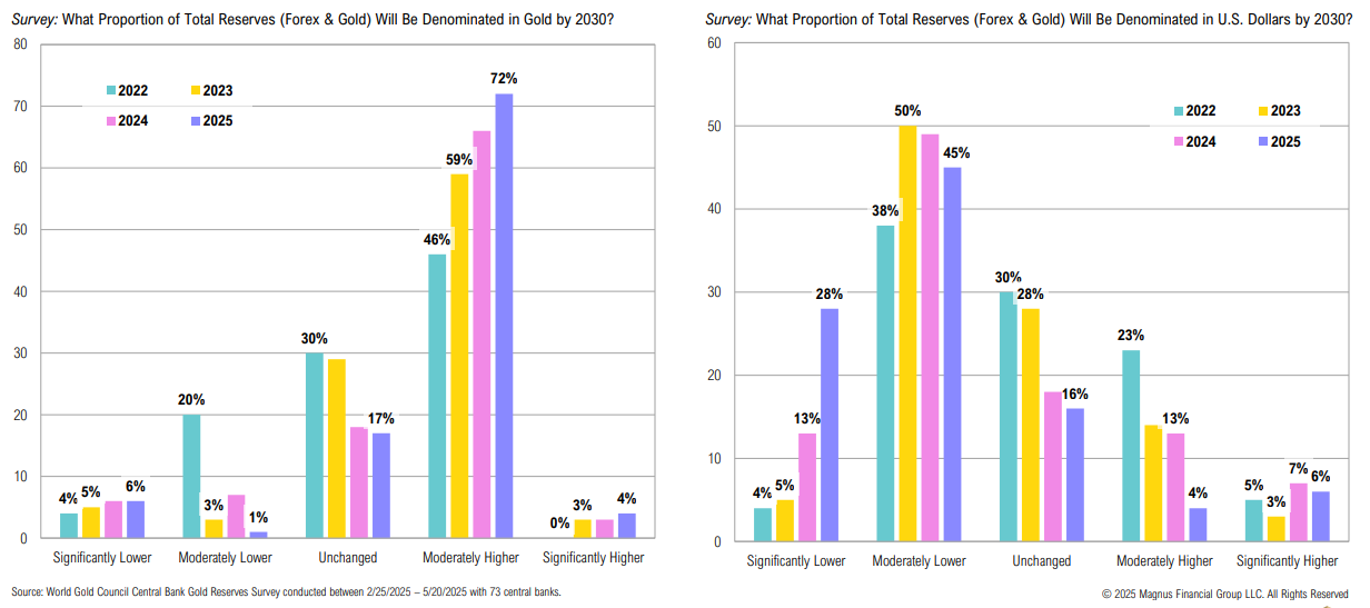 A World Gold Council 2025 survey of 73 central banks indicates sustained demand for gold, as reliance on the U.S. dollar declines