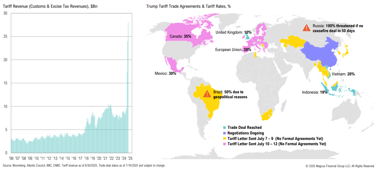 Tariff revenues reached a record $28 billion in June; last week, over 20 countries have received tariff letters from Trump with new rates to be imposed on August 1