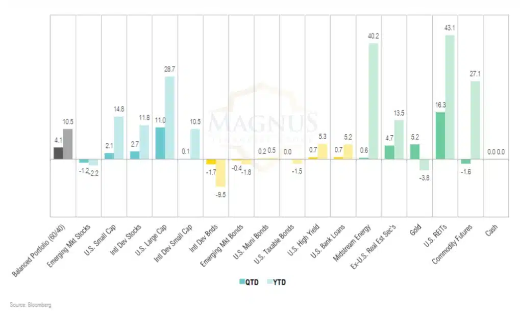 A generally strong quarter for risk assets, especially U.S. REITs and large cap stocks; balanced U.S. portfolios returned 4.1%