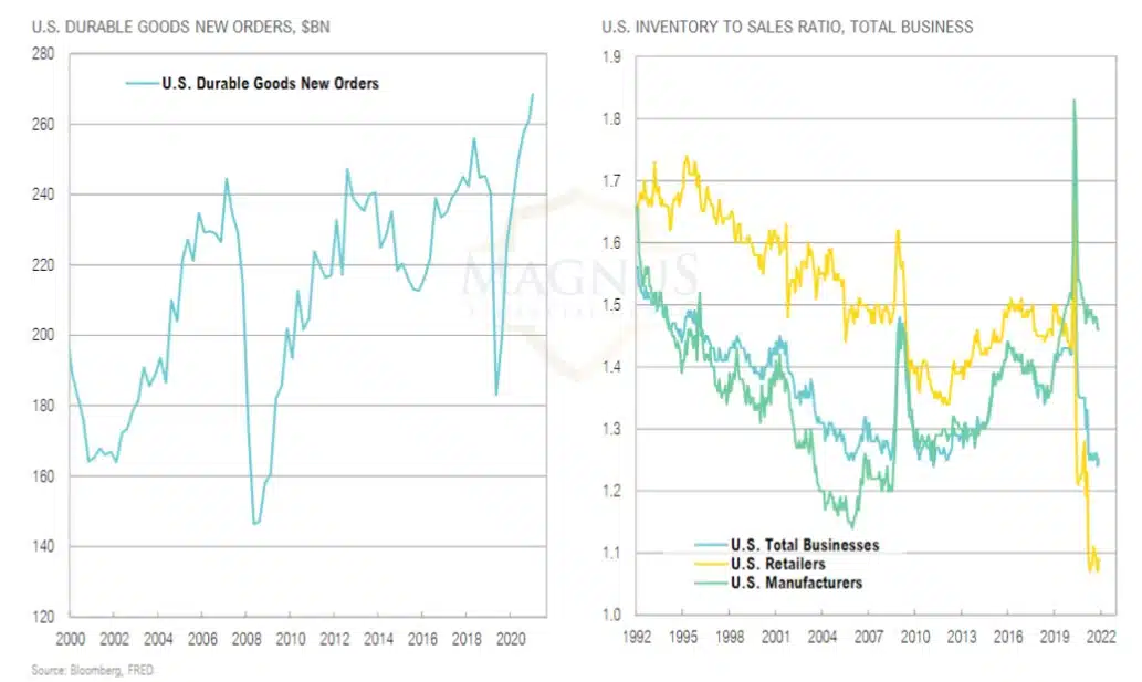 U.S. durable goods orders reached a record as demand remains strong; retailers have struggled to build inventories to match demand
