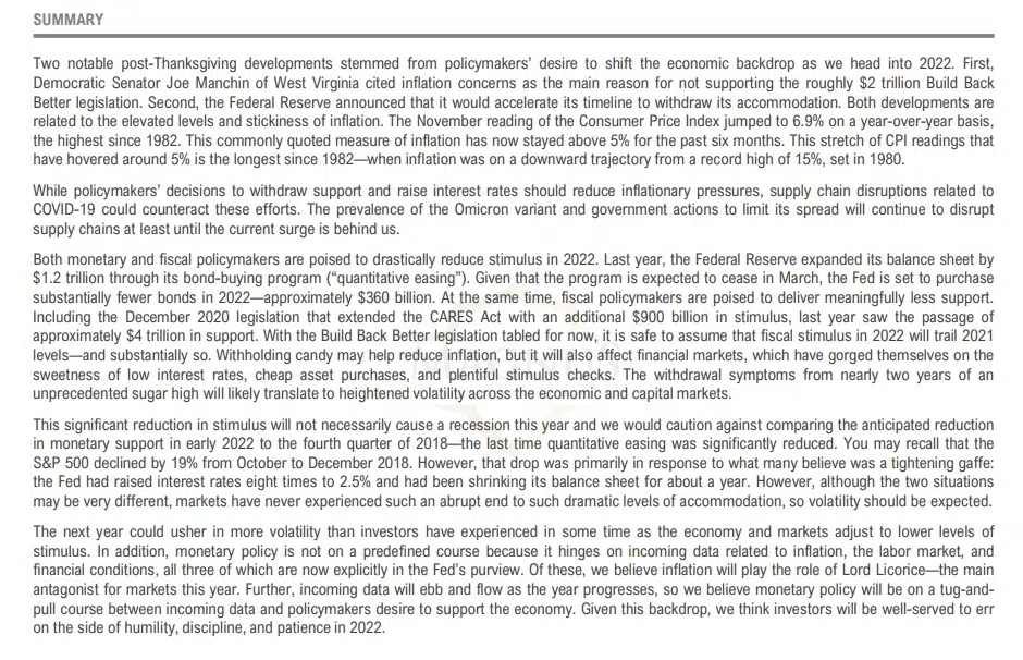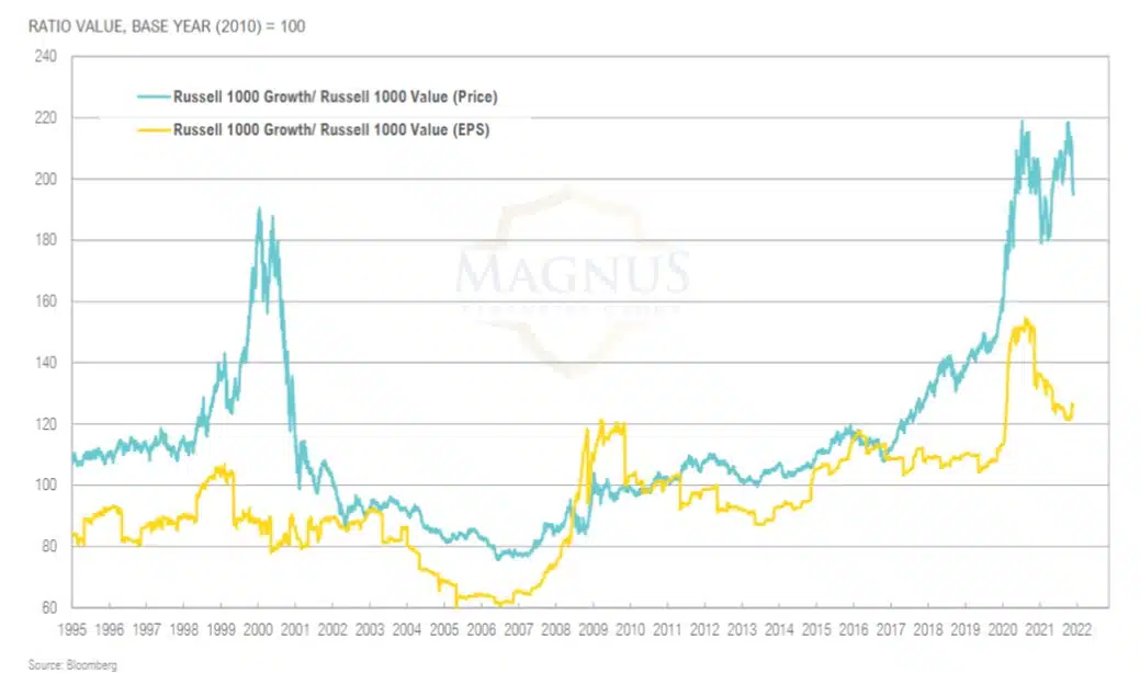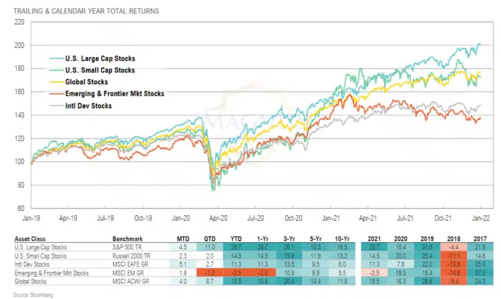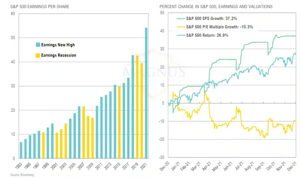 Earnings grew at a faster rate than returns in 2021, resulting in multiple compression in the S&P 500