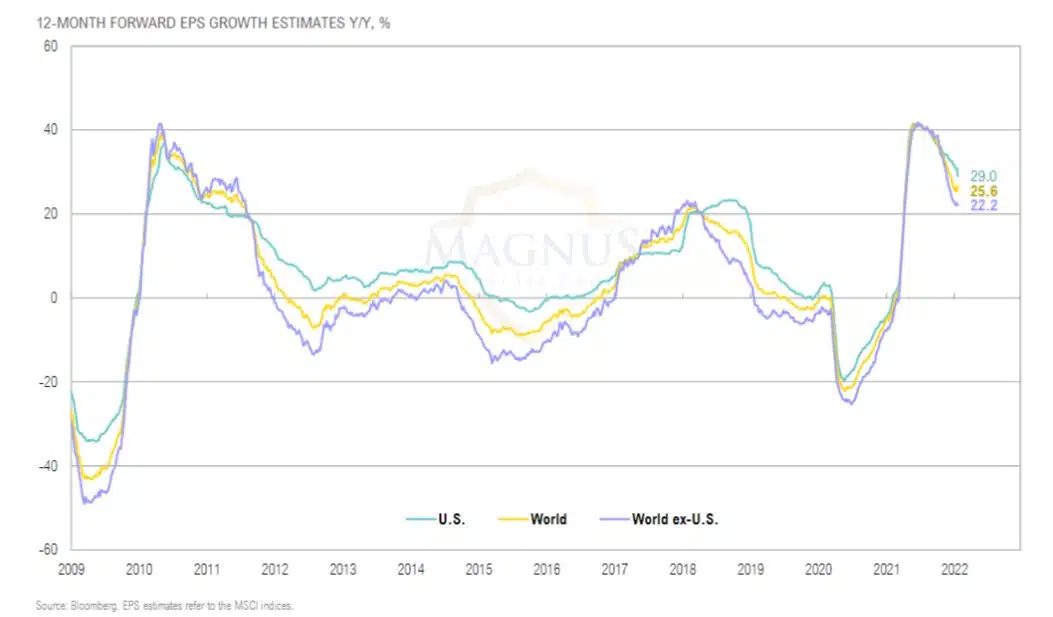 Global EPS growth expectations have slowed; U.S. growth is expected to be higher than the rest of the world in 2022