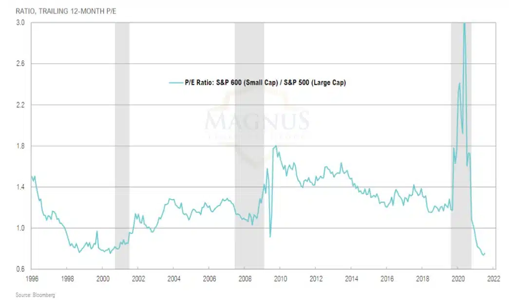 Historically small cap has been more expensive than large cap, but small cap relative valuations are currently near the lowest levels in recent history