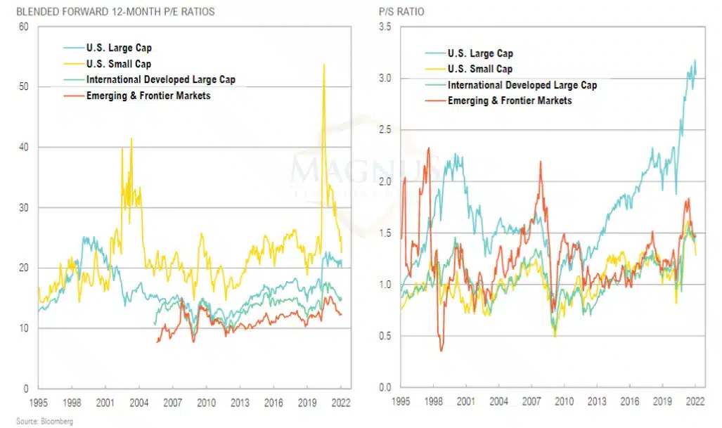 Relative to earnings estimates, emerging & frontier market stocks are cheapest; relative to sales, U.S. Large Cap stocks appear very expensive