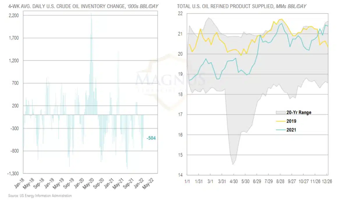 Crude oil inventories have been drawn down each week since November, demand for refined oil remains near multi-decade highs