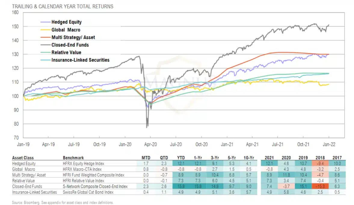 Closed-end funds and hedged equity outperformed for the quarter; global macro had a disappointing end to a lackluster year