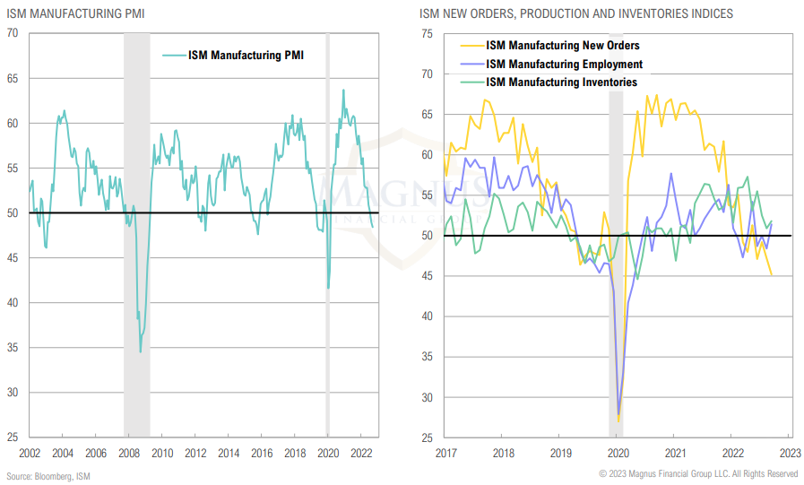 ISM Manufacturing PMI is in contraction; increases in inventories have slowed, while employment has been oscillating between contraction and expansion