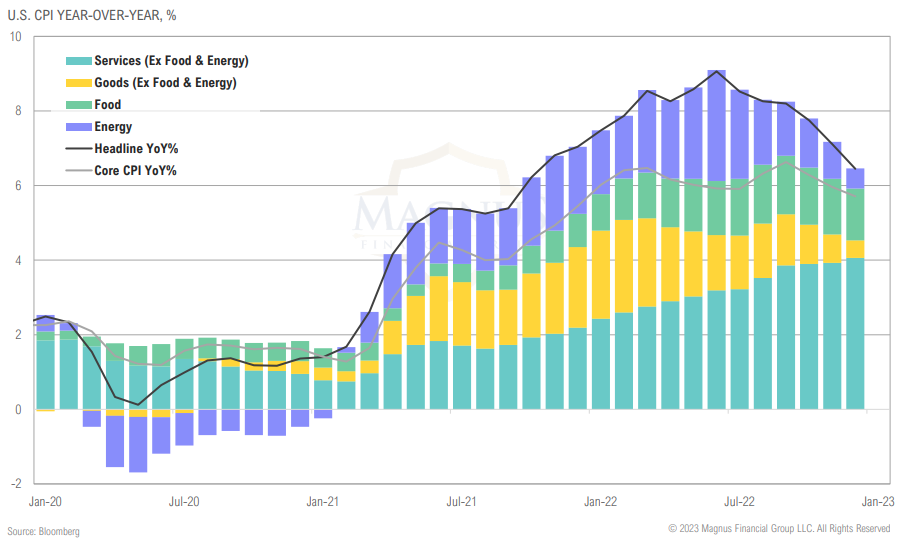 Headline inflation declines largely driven by lower energy and goods prices; core inflation proving more sticky, due to lags in shelter and persistent services inflation