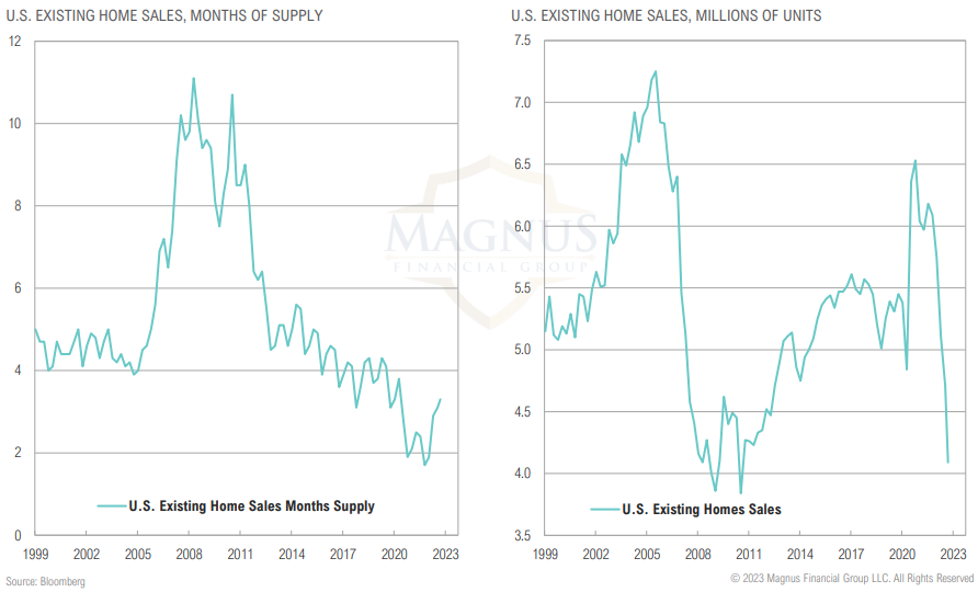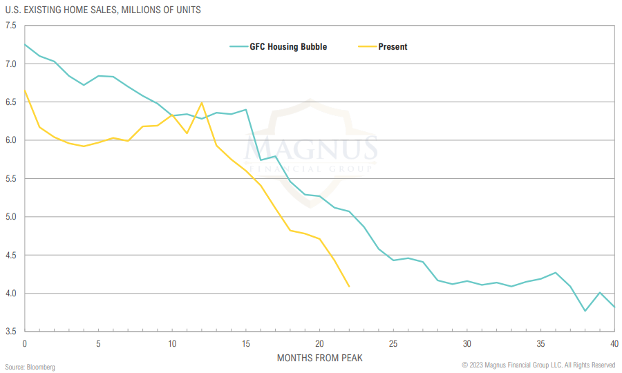 Existing home sales have fallen by 2.5m over the past 22 months, which is a faster decline than during GFC; the difference between now and then is that supply of homes remains low