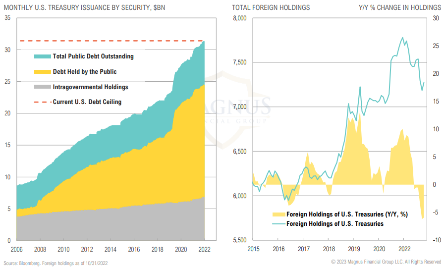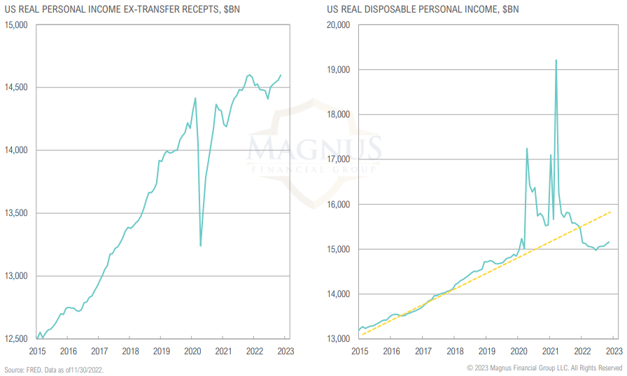 Consumers spending themselves into a wall – real incomes lagging inflation; U.S. consumer is incrementally exhausting COVID stimulus, increasingly relying on credit to maintain spending; combined hit from slowing economy and rising interest rates spells trouble for 2023/2024.
