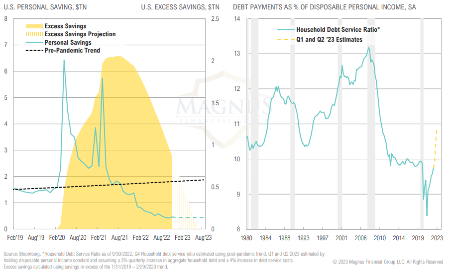 Personal savings rates have plummeted to 2.4% vs 5-year pre-Covid average of 7.6%; if this savings rate continues, excess savings from Covid will be depleted by June ‘23