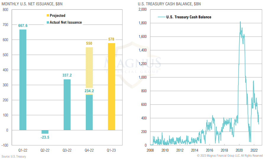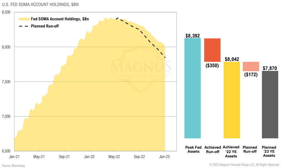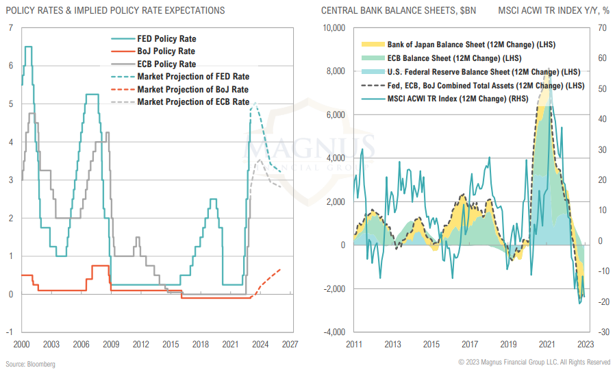 Global quantitative easing efforts supported the recent gains in global stocks; Fed, ECB and BoJ combined 12M change in assets have been negative since June ‘22