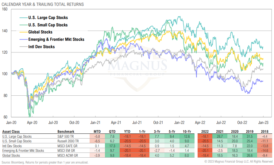 U.S. stocks underperformed their international peers over the fourth quarter, largely driven by a weaker dollar; DM stocks held up best over the year, driven by a mammoth Q4 rebound